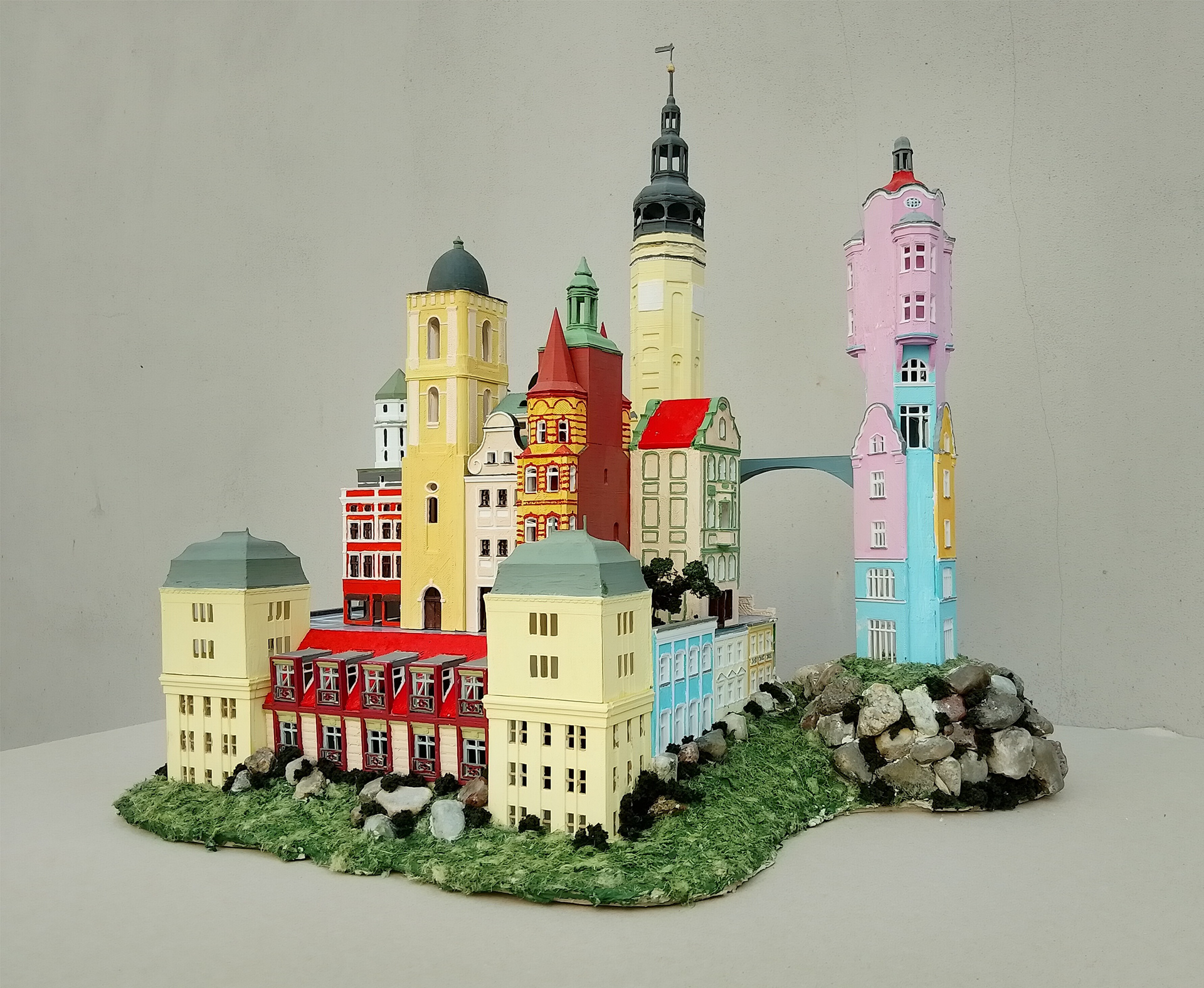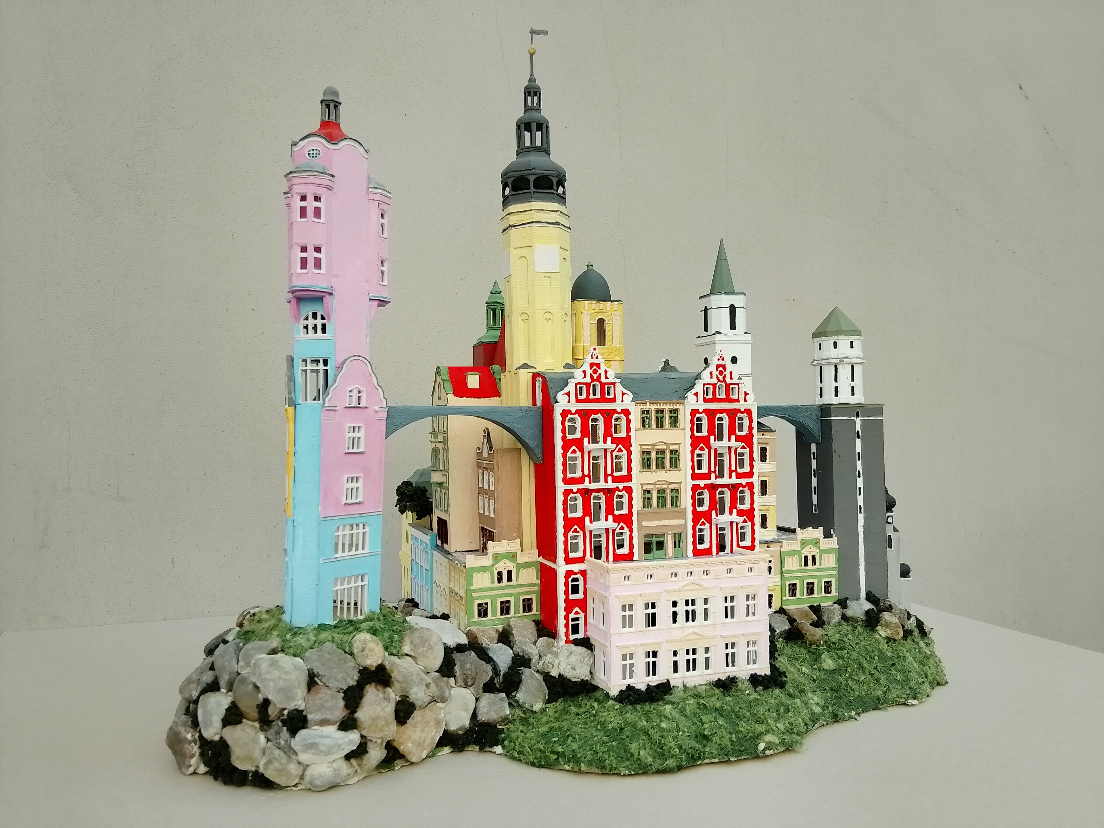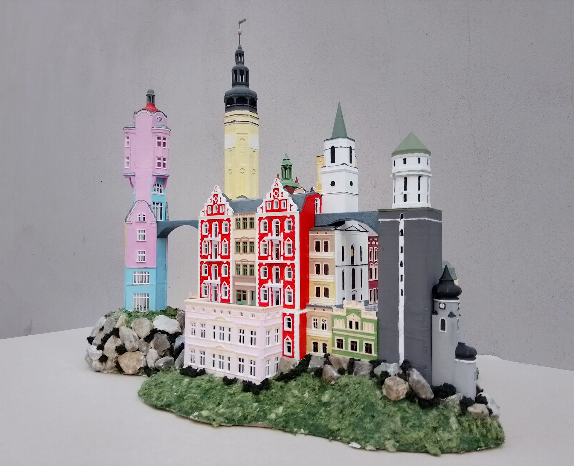 Kompozycja przestrzenna wykonana z pomocą druku 3D przedstawia wizerunek miasta w formie zamku zbudowanego z najbardziej rozpoznawalnych budynków Zielonej Góry. W prezentowanej kompozycji architektura miejska przekształcona jest w bajkową strukturę, w której miejskie wieże, ratusz, kamienice i kościoły tworzą zintegrowaną całość. Nierealistyczne zestawienie budynków w kompozycji jest swoistą fantazją nawiązującą do twórczości Marcina Kołpanowicza. Wiele jego obrazów na pierwszym planie przedstawia surrealistyczne zestawienia architektoniczne składające się z mnogości budynków, które tworzą zwartą całość. Prezentowana praca wykonana jest z pomocą drukarki 3D, dzięki której możliwe było wykonanie kompozycji w sposób precyzyjny. Wydrukowane elementy szlifowałem, skleiłem ze sobą oraz nałożyłem na nie warstwę gipsu, aby uzupełnić drobne niedoskonałości techniczne oraz uzyskać tynkowaną fakturę charakterystyczną dla elewacji budynków. Wydruki pomalowałem farbą akrylową. Kolorystyka wydrukowanych budynków w kompozycji naśladuje tą rzeczywistą. Zestawienie różnobarwnych obiektów ma na celu nie tylko oddanie charakteru miasta, lecz także ukazanie autorskiej interpretacji jego atmosfery i tożsamości. Sam zamysł zestawienia charakterystycznych budynków w formie zamku ma na celu