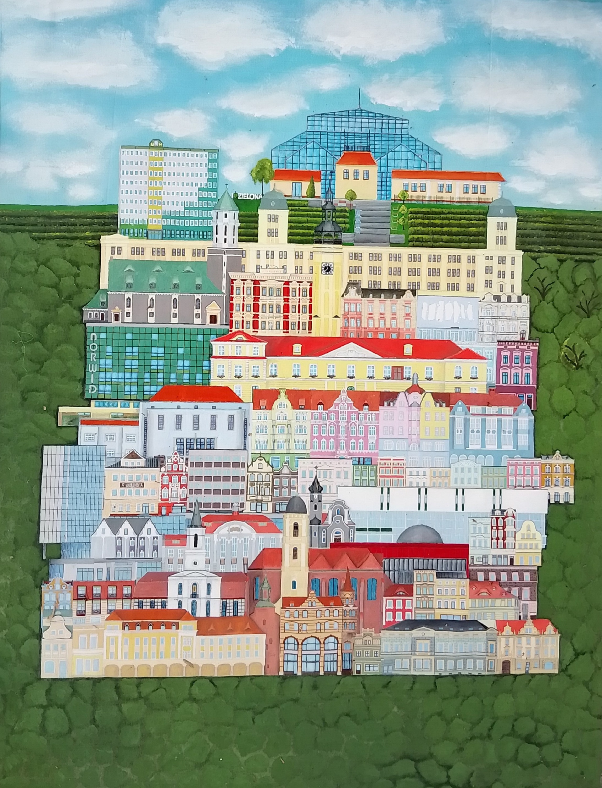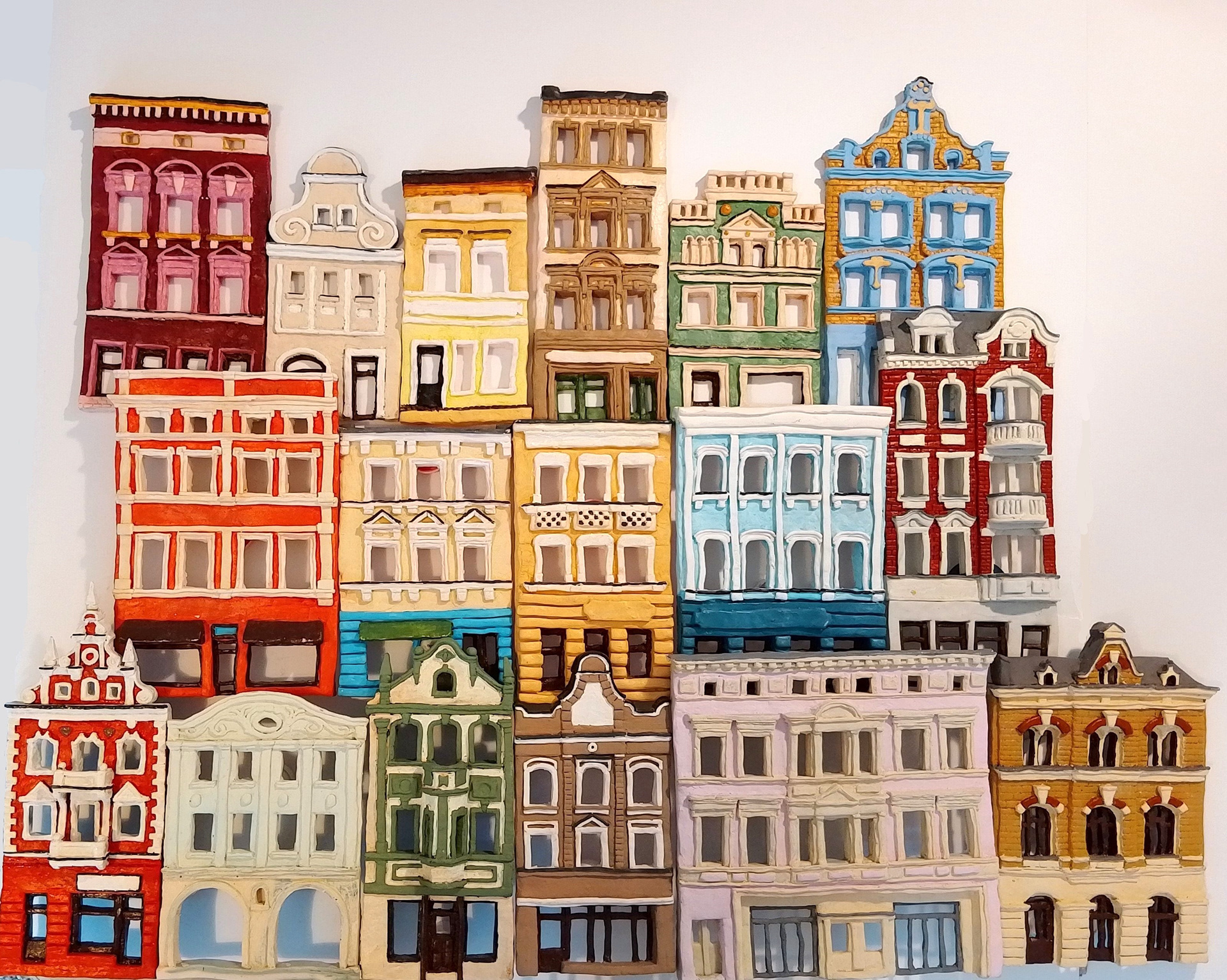 Kamienice zielonogórskie; praca ręczna w modelinie; 55 x 80 cm;